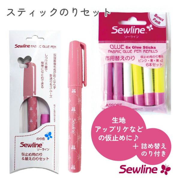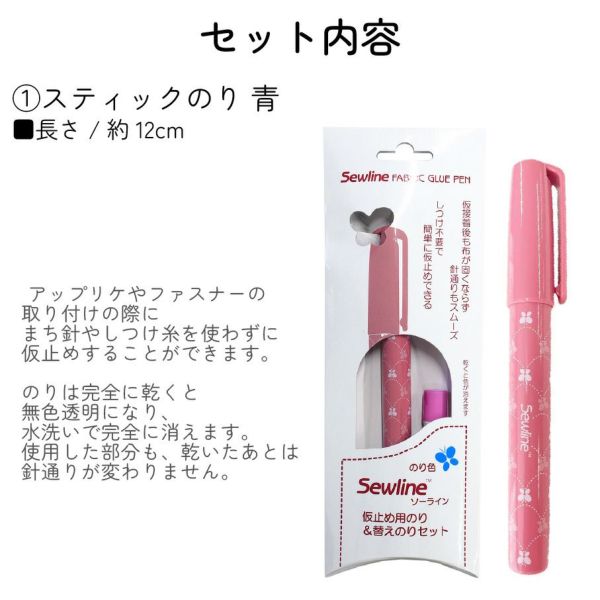 布にサッと塗るだけで仮止めできる便利なのりペンセット です。