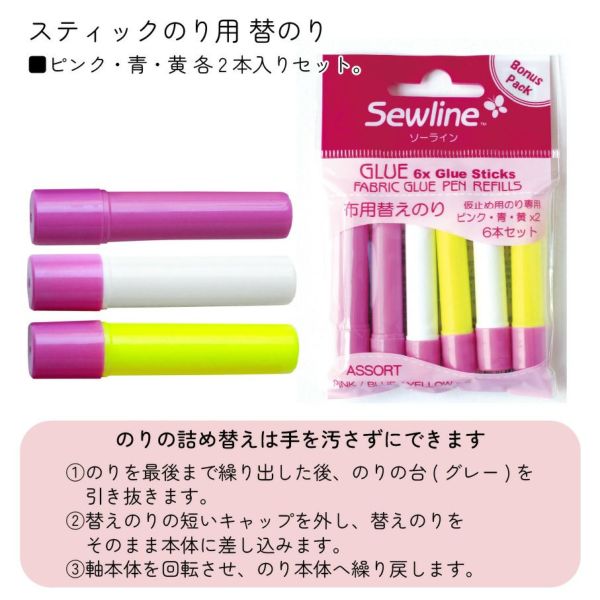 ② 替えのり ×6本(ピンク・青・黄 各2本)