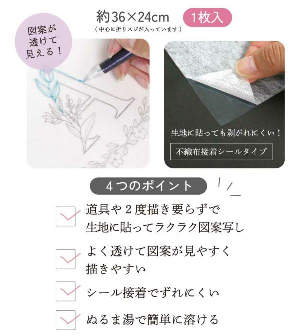 刺繍 シート 図案写し 水に溶ける シールタイプ 生地に貼って使う水溶性デザイントレースシート シール接着 36×24cm 1枚入 転写 溶ける 紙 ペーパー 図案写し 図案シート 手芸 ハンドメイド つくる楽しみ