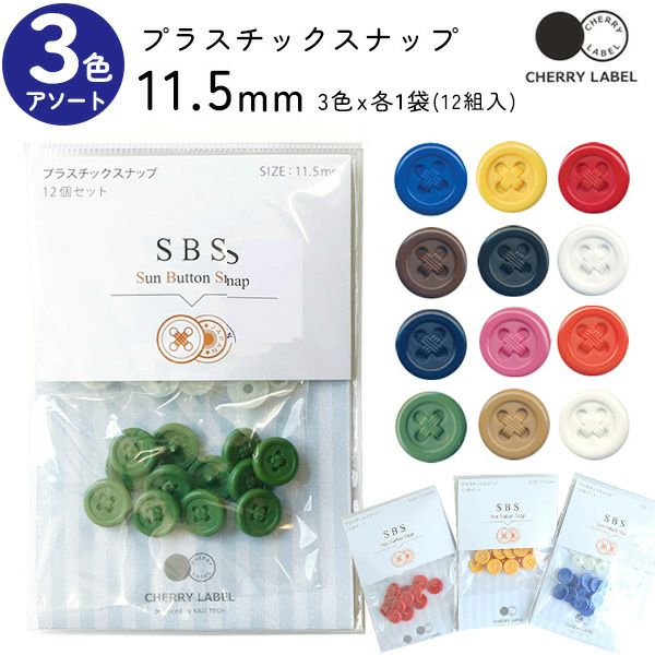 - プラスチックスナップ ボタン 釦 (12組x3袋入) ぼたんのみ 11.5mm CHERRY LABEL チェリーレーベル サンボタン
