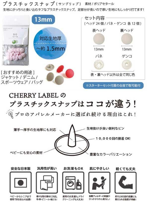 生地にしっかり食込むタフなプラスチックスナップ。