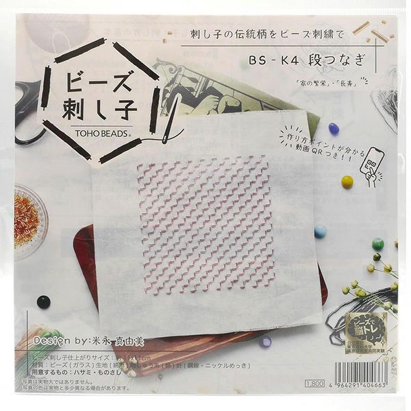 ビーズの刺しゅう線がプリントされた「ビーズ刺し子専用生地」を使用。