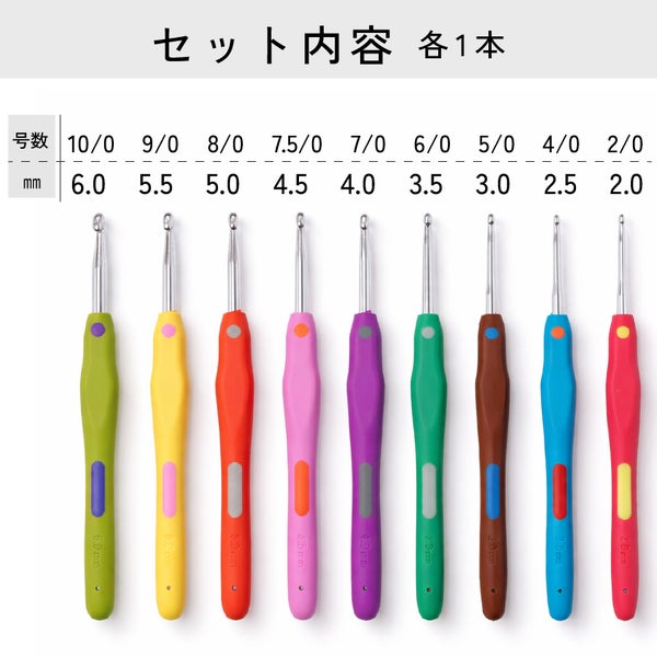 柔らかく握りやすいグリップで、初心者の方でも扱いやすいかぎ針セット。