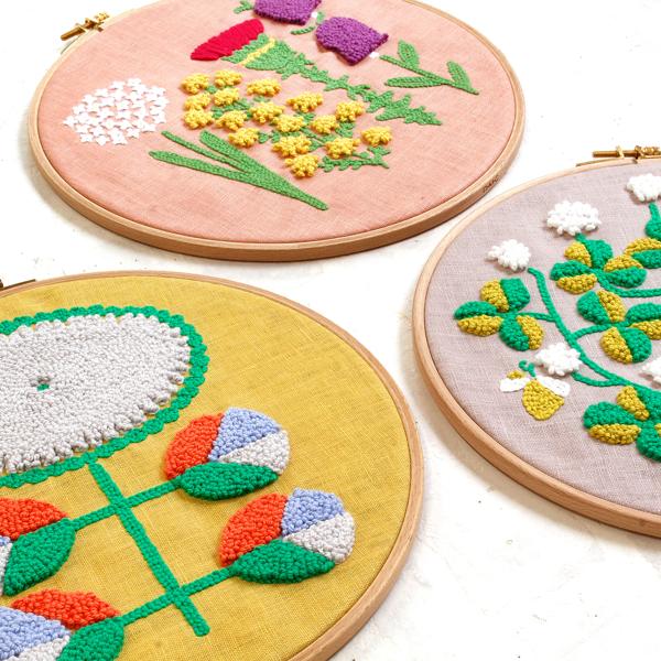 リネン100%の布に太めのコットン糸で刺していくので、直径25cm刺繍枠に配置した大きなデザインもスムーズに仕上がります。