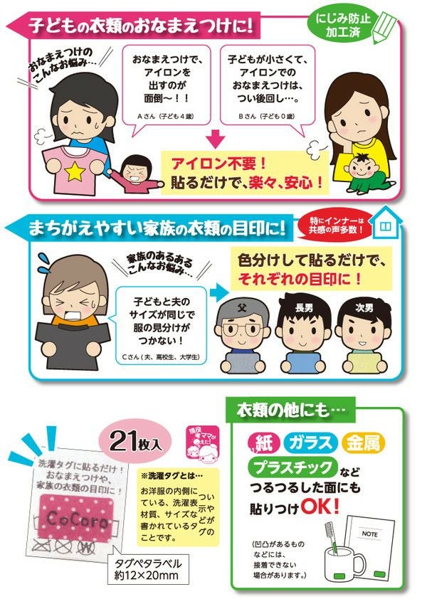 アイロン不要!洗濯タグに貼るだけで、おなまえつけが完了するラベルです。