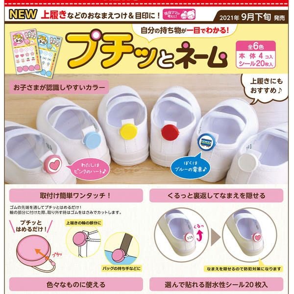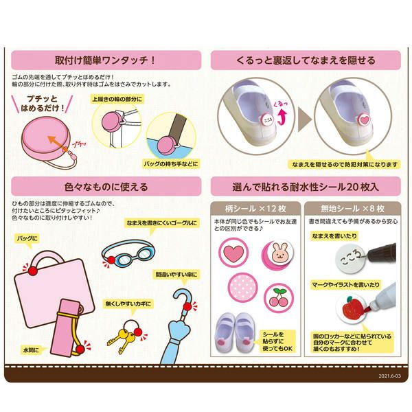 上履きなどのおなまえつけ&目印に!ゴムの先端を通してプチっとはめるだけ。