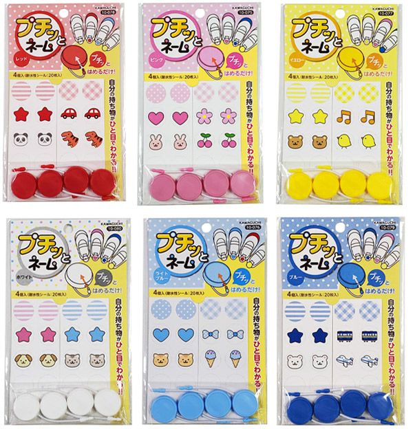 犬、ねこ、うさぎ、さくらんぼソフトクリーム、リボン、くま、ひよこ、パンダ、恐竜、飛行機、電車、車、ストライプ、チェック、水玉、音符等、カラーによって異なるかわいいシールとお名前が書ける白いシールが20枚付いています。