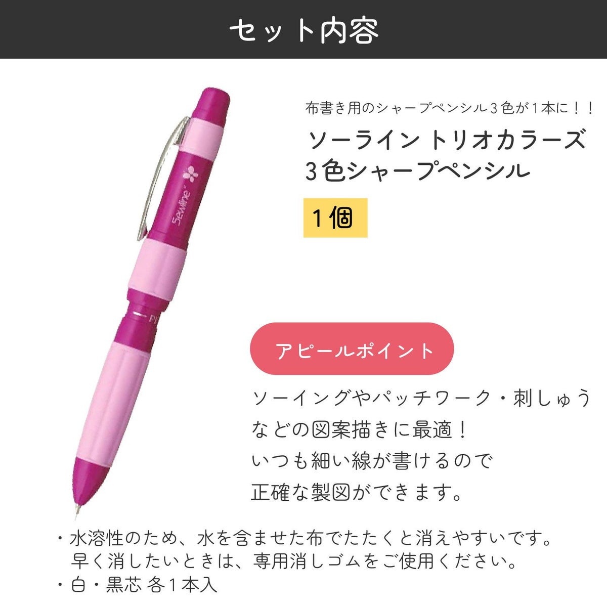 他の画像を見る TU-0500069103 布書きシャーペン 替芯セット 3色 トリオシャーペン&替芯カラーズ Sewline 生地 水で落ちる 消える 生地に書ける 描ける ¥ 2,200 税込 お気に入りに登録する