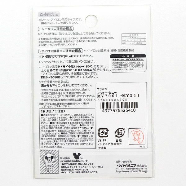 他の画像を見る MY7001-MY541 パイオニア ディズニー ミッキーマウス/ミニーマウス 2個付きワッペン アイロン&シール両用タイプ 入園入学 小学生 保育園 キャラクター ¥ 770 税込 お気に入りに登録する