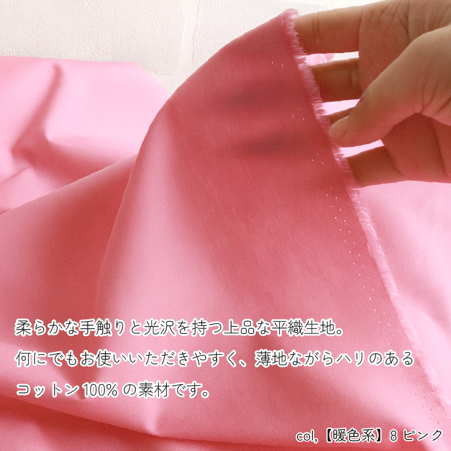 他の画像を見る B64500-ALL 生地 無地 綿ブロード コットンブロード 無地 日本製 112cm巾 コットン100% シャツ ブラウス マスク ハンドメイド 洋裁 小物 パッチワーク さらり やわらかい 高密度 扱いやすい 全54色展開 最低単位50cm~10cm単位の切売 ¥ 70 税込 お気に入りに登録する
