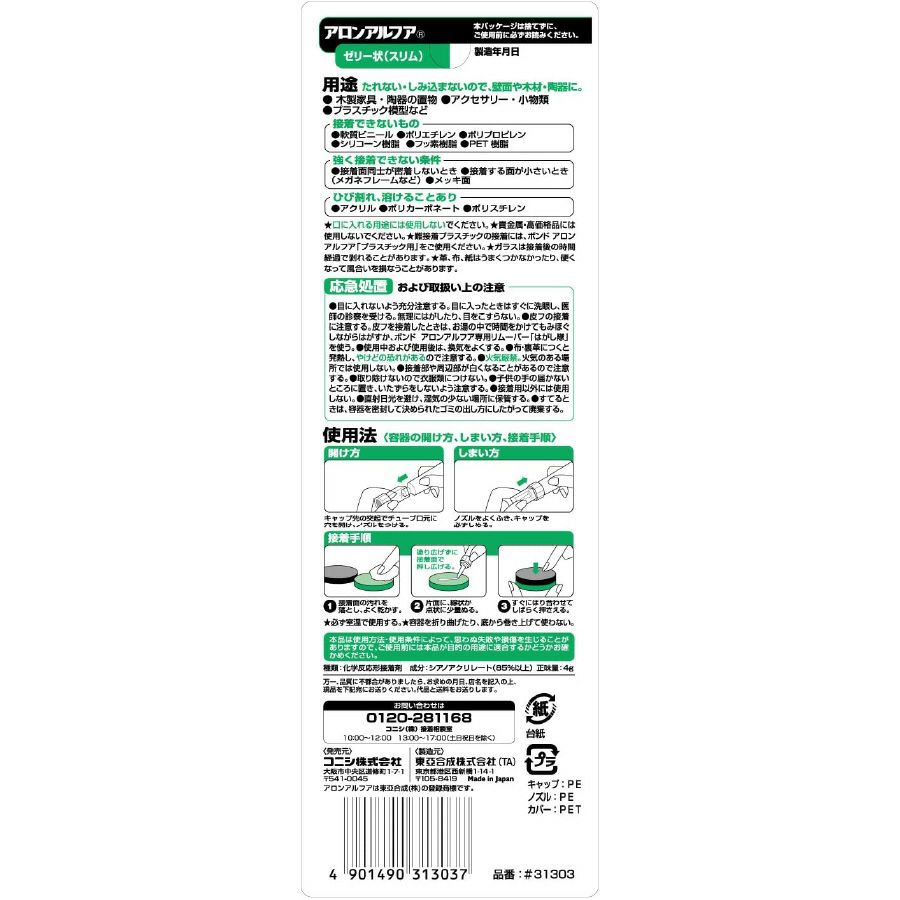 他の画像を見る BON31303 接着剤 アロンアルファ ゼリー状 スリム 多用途 硬質プラスチック・ゴム・陶磁器・金属・木などの接着 コニシボンド KONISHI ¥ 616 税込 お気に入りに登録する